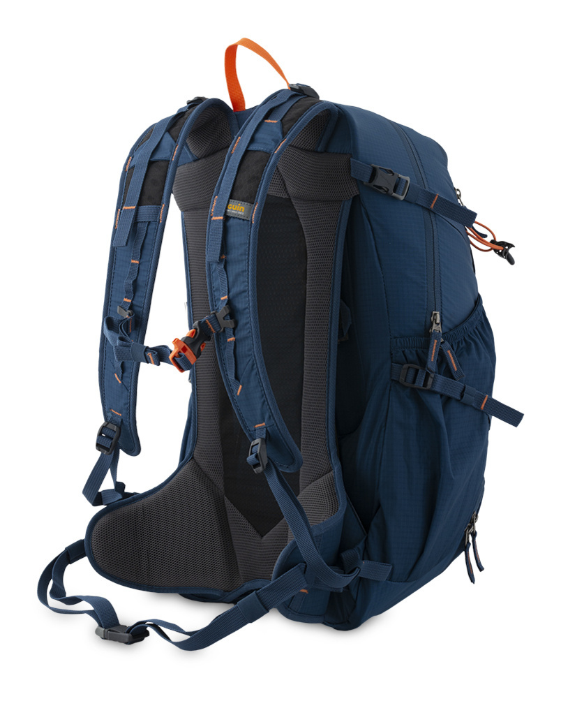 Особенности модели включают интегрированную съемную дождевую накидку, регулируемый и съемный нагрудный ремень с аварийным свистком, компрессионные ремни для стяжки и стабилизации груза, а также множество карманов и креплений, включая сетчатые боковые карманы для бутылок и крепления для треккинговых палок. Рюкзак дополнен светоотражающим элементом для безопасности и удобными эластичными петлями для дополнительного снаряжения, что делает его универсальным помощником в активных путешествиях.