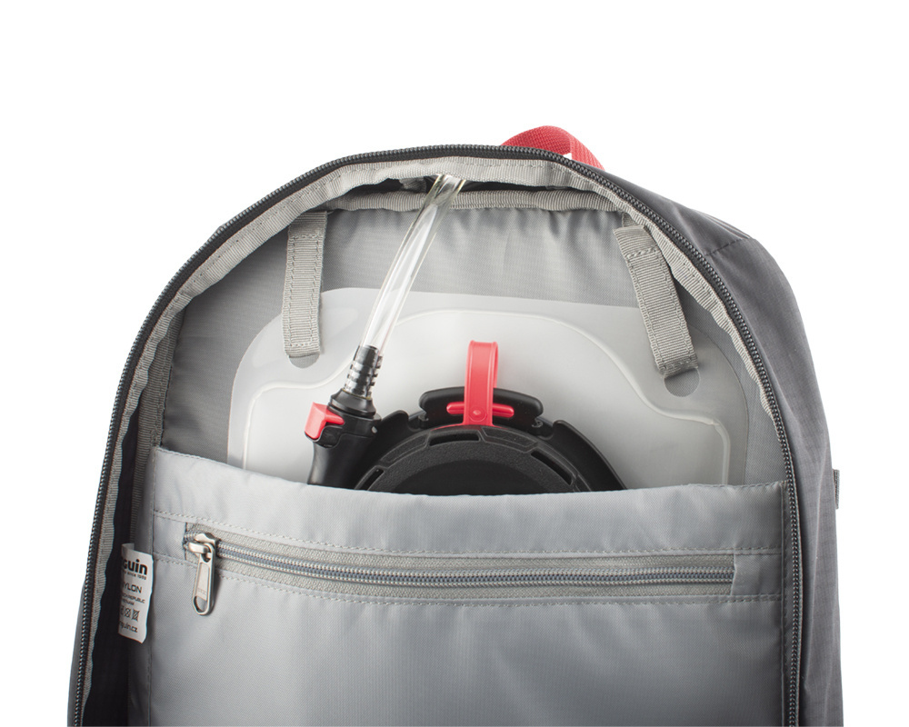 Рюкзак оснащен несколькими удобными карманами, включая верхний с карабином для ключей и просторный фронтальный для быстрого доступа к необходимым мелочам. Предусмотрен светоотражающий элемент и встроенный дождевик, размещенный в отдельном кармане. Кроме того, имеются боковые компрессионные ремни, регулируемый и съемный грудной ремень со свистком, а также предусмотрено место для питьевой системы с выводом шланга.