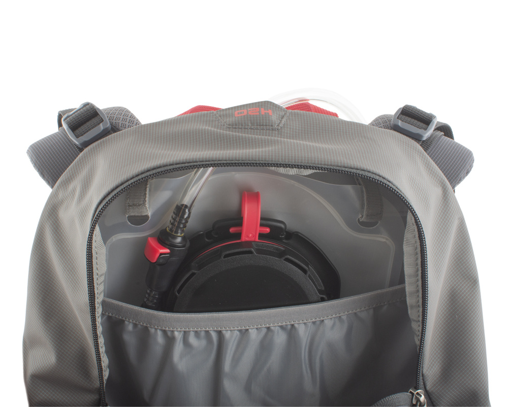 Рюкзак совместим с питьевой системой — есть отдельное отделение для гидратора и удобный вывод трубки между плечевыми лямками. Усиленные плечевые ремни с мягкими накладками, регулируемый нагрудный ремень со свистком и съемный поясной ремень обеспечивают комфортную посадку и эффективное распределение веса. Продуманная система карманов включает вместительный фронтальный карман на молнии с внутренним сетчатым отделением и карабином для ключей, боковые сетчатые карманы для бутылок. Интегрированный дождевик в отдельном нижнем кармане защитит вещи в непогоду.
